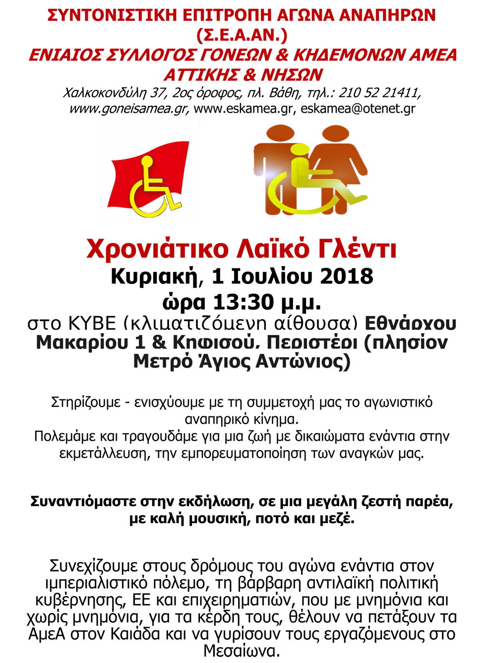 Το χρονιάτικο γλέντι της Σ.Ε.Α.ΑΝ. και του Ενιαίου Συλλόγου Γονέων και Κηδεμόνων ΑμεΑ Αττικής και Νήσων, που ήταν να γίνει το Σάββατο 23 Ιουνίου και αναβλήθηκε λόγω κακοκαιρίας, θα γίνει την Κυριακή, 1 Ιουλίου, 13:30 μ.μ., στο ΚΥΒΕ (κλιματιζόμενη αίθουσα) Εθνάρχου Μακαρίου 1 & Κηφισού, Περιστέρι (πλησίον Μετρό Άγιος Αντώνιος).